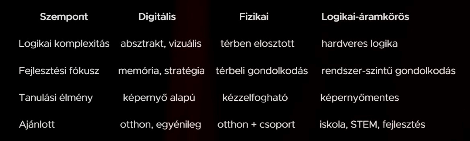 Képernyőmentes, mégis modern és mély logikai tanulási élmény. A fizikai megvalósítás a digitális logika alapjait akár háromdimenziós játéktérbe is átültetheti.